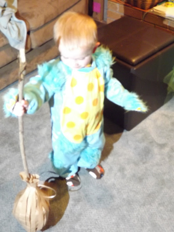 Payton is a mermaid. Her costume is a little harder to adjust but is cute once all the bunching is done. Maddie first made some witches brooms filled with treats for the kids. Payton got into it pretty quick but Connor thought he first was churning butter with the stick and was happy with that.